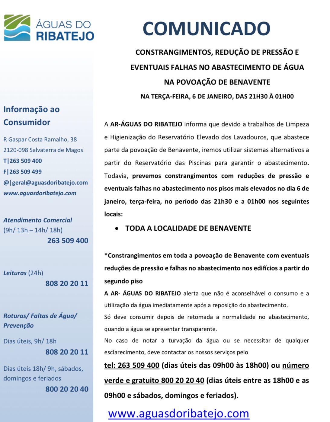 Constrangimentos, redução de pressão e eventuais falhas no abastecimento de água – Povoação de Benavente