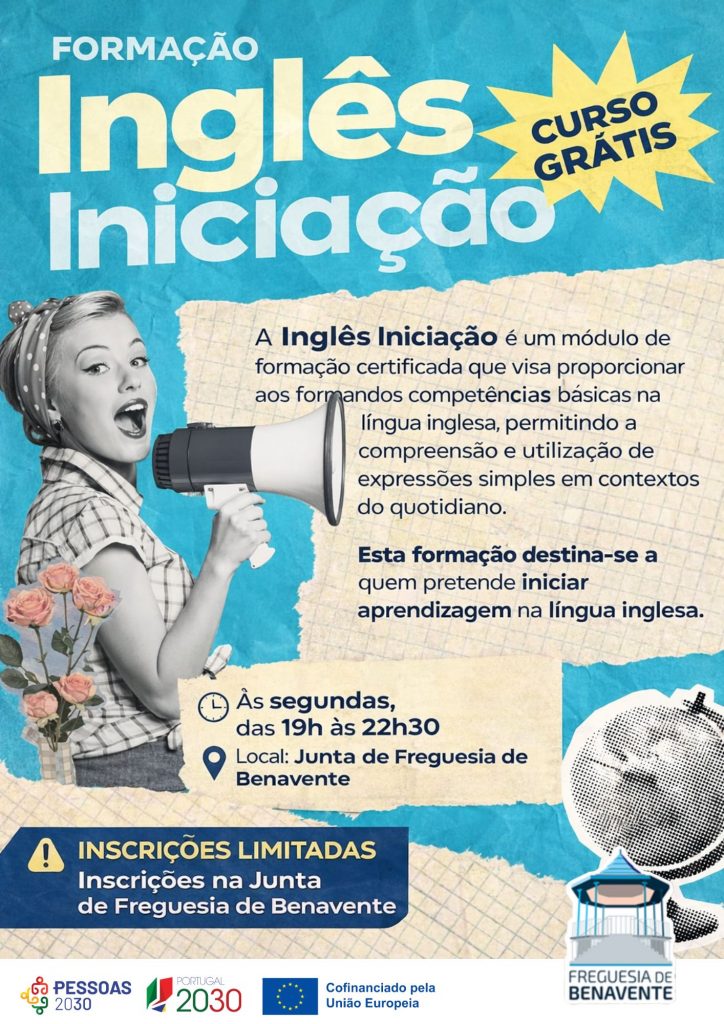 A Junta de Freguesia de Benavente vai promover a UFCD 2210 – Inglês Iniciação, uma formação certificada e gratuita, destinada a todos os que pretendem iniciar a aprendizagem da língua inglesa.